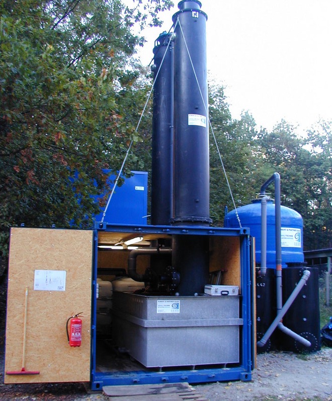 Die auf 15 m³/h ausgelegte Grundwasserreinigungsanlage bestand aus einem Wirbelschicht-Bioreaktor zum biologischen Abbau der MKW mit nachgeschalteten Stripp-kolonnen zur Entfernung der leichtflüchtigen Schadstoffe (BTEX). Durch die Lage des Tanklagers in einem Waldgebiet verfügte das Grundwasser über hohe Huminstoffgehalte, die sich negativ auf die Adsorptionsrate von Wasseraktivkohle auswirken und den WAK-Einsatz unwirtschaftlich machte. Daher wurde zur Entfernung der leichtflüchtigen Schadstoffe die Anlage mit insgesamt drei in Reihe geschalteten Strippkolonnen ausgestattet, mit denen die geforderten Reinigungszielwerte zur Einleitung in den angrenzenden See jederzeit ohne Einsatz von Wasseraktivkohle erreicht wurden.